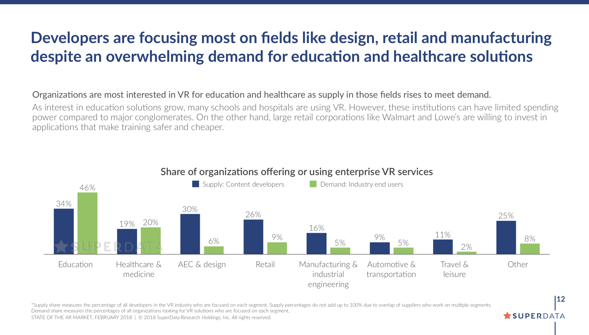 Nearly half of VRs’ enterprise users are educational companies and institutions. Schools and hospitals are using VR but can have limited spending power. A smaller number of major conglomerates in fields like retail and automobiles are willing to invest substantially in VR.